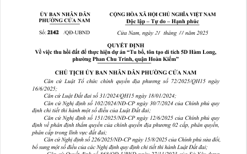 Quyết định việc thu hồi đất để thực hiện dự án "Tu bổ, tôn tạo di tích 5D Hàm Long, phường Phan Chu Trinh, quận Hoàn Kiếm