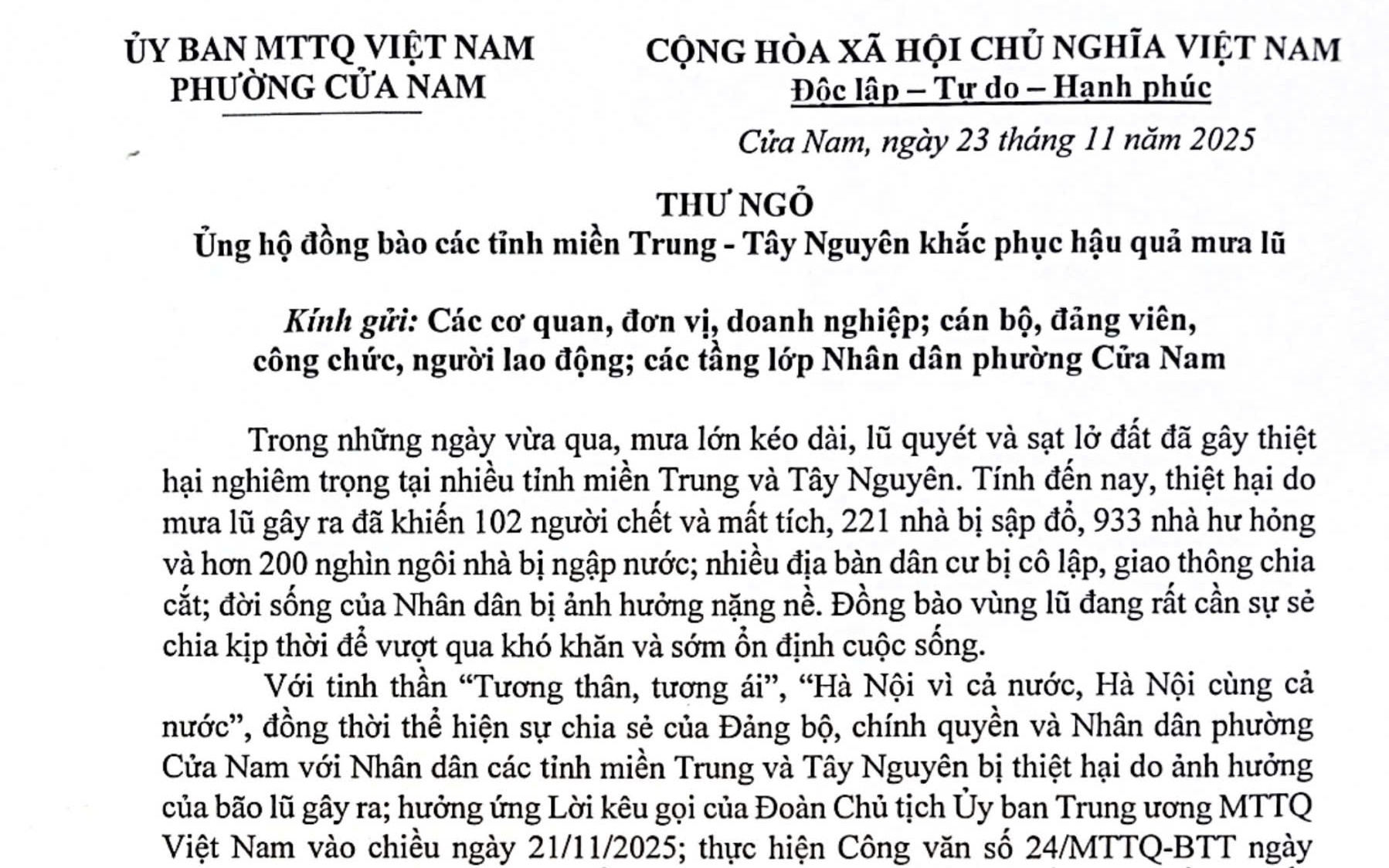 Trong những ngày qua, mưa lũ kéo dài, lũ quét và sạt lở đất đã gây nguy hiểm thiệt hại nghiêm trọng cho các tỉnh miền Trung và Tây Nguyên. Đòng bào miền lũ đang cần sự sẻ chia kịp thời để vượt qua khó khăn và sớm ổn định cuộc sống. Với tinh thần tương thân tương ái "Hà Nội vì cả nước, Hà Nội cùng cả nước". UB MTTQ VN phường Cửa Nam kêu gọi các cơ quan đơn vị sự nghiệp và nhân dân trên địa bàn phường tích cực hưởng ứng đợt ủng hộ.