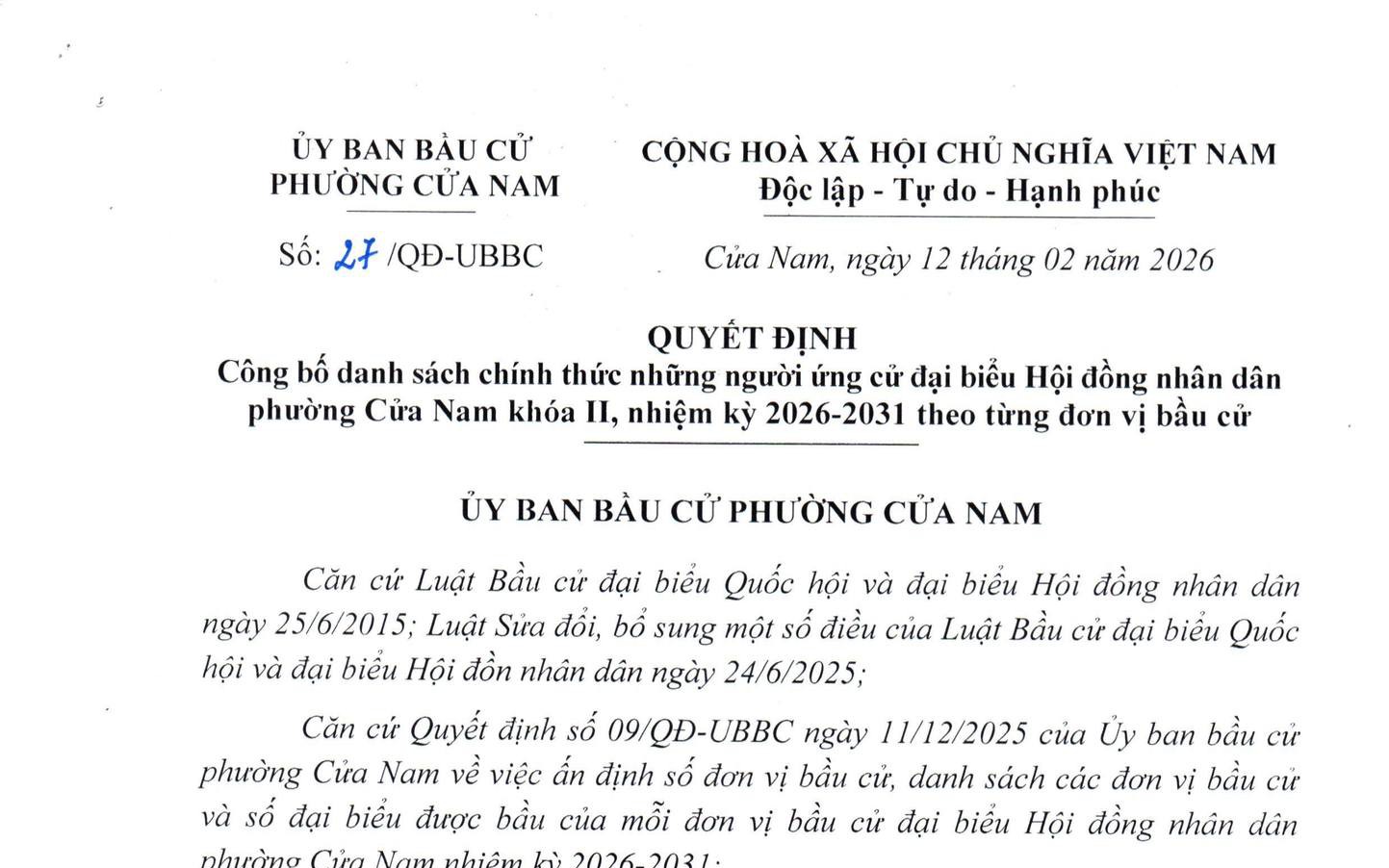 Ủy ban Bầu cử phường Cửa Nam đã ban hành Quyết định số 27/QĐ-UBBC ngày 12/02/2026 về việc công bố danh sách chính thức những người ứng cử đại biểu HĐND phường Cửa Nam khóa II, nhiệm kỳ 2026–2031 theo từng đơn vị bầu cử