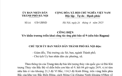 Công điện về việc khẩn trương triển khai công tác ứng phó với bão số 9 (siêu bão Ragasa)