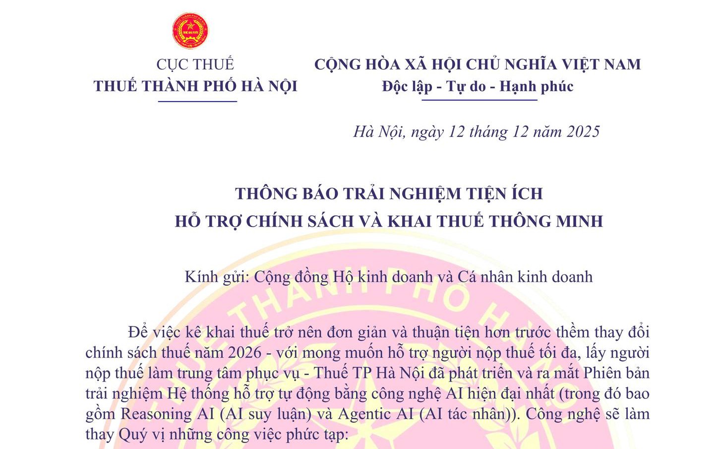 Nhằm hỗ trợ hộ kinh doanh, cá nhân kinh doanh trước thềm thay đổi chính sách thuế năm 2026, Thuế Thành phố Hà Nội ra mắt phiên bản trải nghiệm hệ thống hỗ trợ khai thuế bằng công nghệ AI hiện đại.